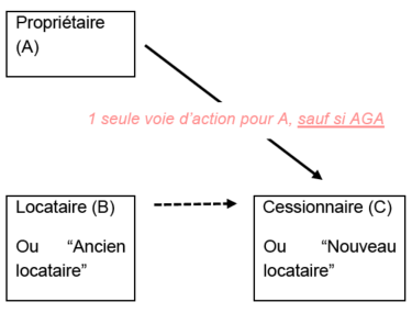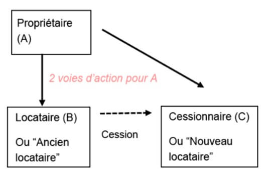 Dans un bail antérieur à 1996, vous aurez un propriétaire (A) et un locataire en place (B). Si B décide de céder son bail au cessionnaire (C), C devient alors le nouveau locataire et B l'ancien locataire. Si C ne respecte pas les termes du bail, A aura soit le choix de poursuivre en exécution forcée du bail soit C (en tant que locataire défaillant), soit B (en tant que partie au contrat initial).